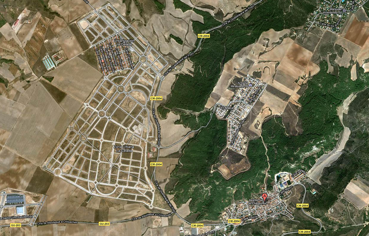 - ¿Tiene sentido exigir mayor construcción cuando tenemos tantos ejemplos de construcción desmesurada como Chiloeches, que iniciaron obras que multiplicaban por 10 su superficie y jamás llegaron a acabarse (la imagen y la información las he encontrado en este post del blog de Jaume Casadevall) o en el sonado caso de "Residencial Francisco Hernando" en Seseña? ¿Hay una demanda real de tanta construcción?