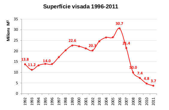 - Viendo el gráfico de evolución de superficie visada entre 1960 y 2011 se ve claramente que el año 2006 fue el punto álgido en cuanto a visados, así que tomar como referencia ese dato como algo normal no es correcto, máxime cuando muchos sitúan el boom de la construcción en el año 2008, es decir cuando se construyeron todos los proyectos visados dos años antes. Creo (y esto es una opinión no contrastada) que uno de los problemas que ha llevado a la situación actual ha sido precisamente el de dar por habitual algo que era excepcional, lo cual conlleva un estilo de vida y una estructura empresarial que no van acordes con la realidad.